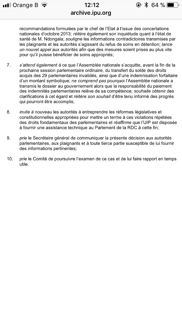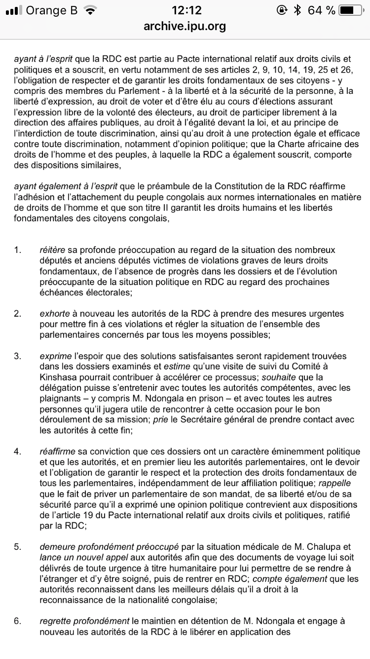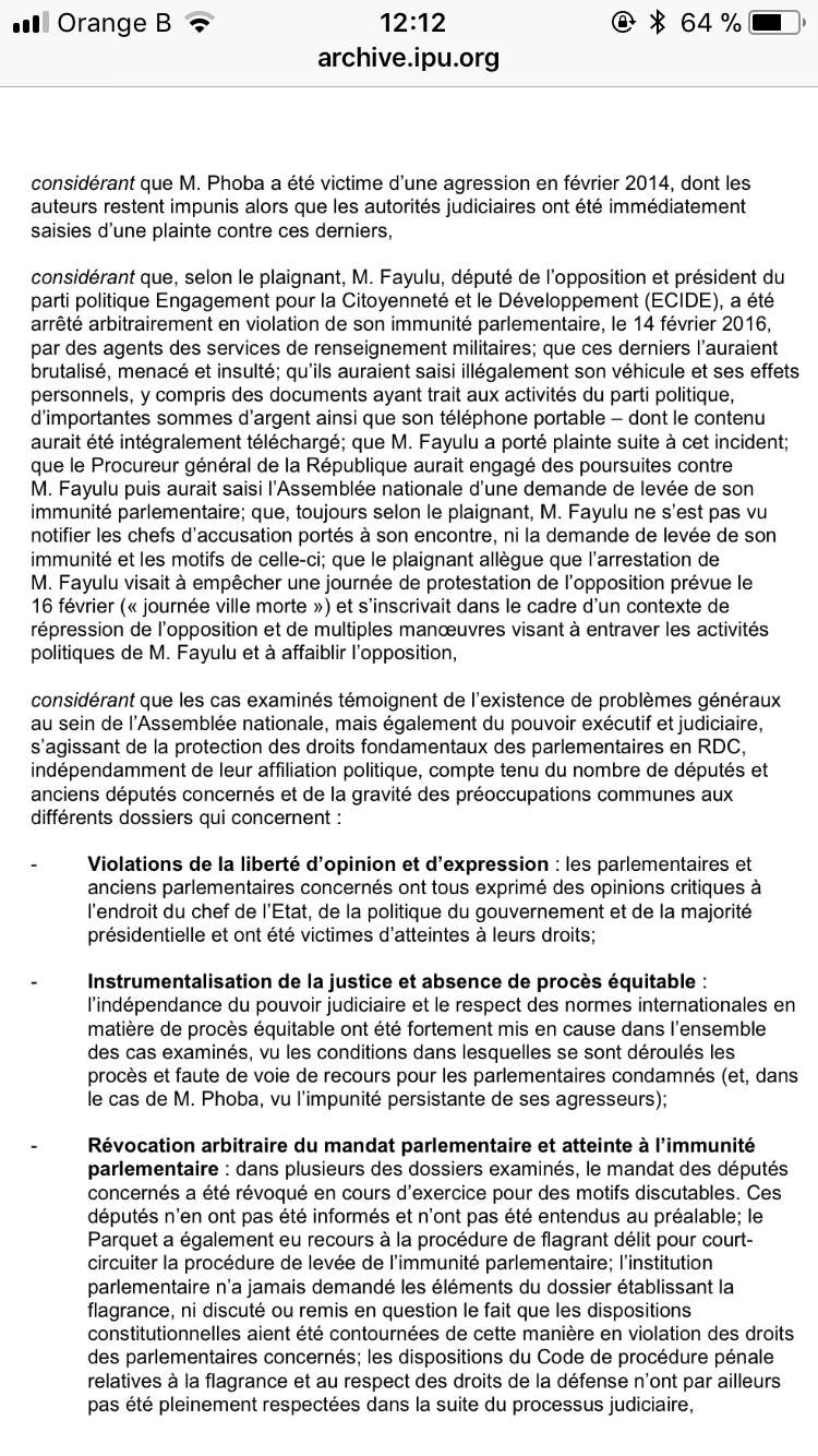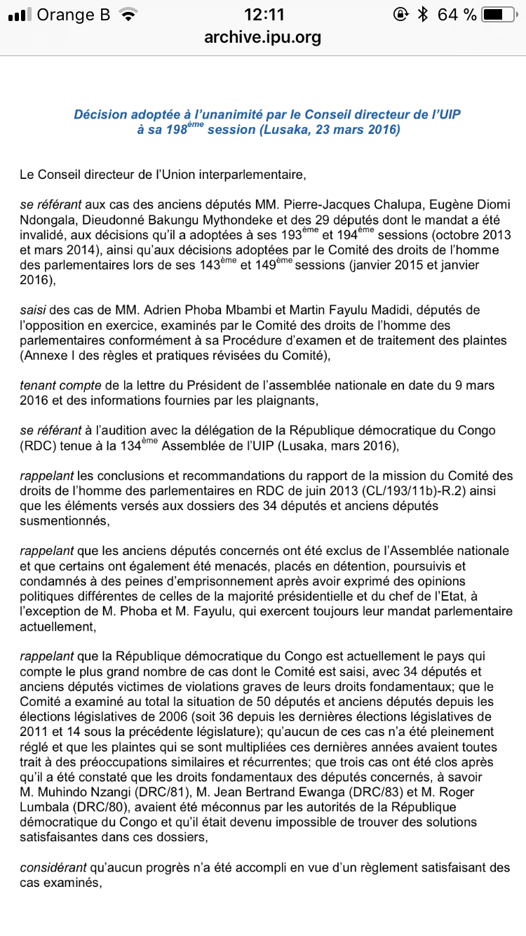 Pour rappel, en 2012, grâce notamment à la requête introduite suite à notre implication, la RDC a été sévèrement condamnée par l’UIP, malgré l’armada diplomatique, juridique et financière déployée en vain par Aubin Minaku, le président de l’Assemblée nationale congolaise. (Voir les documents détaillés en annexes).