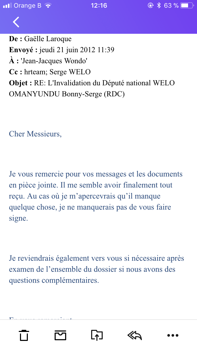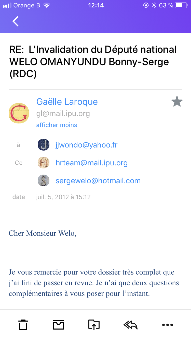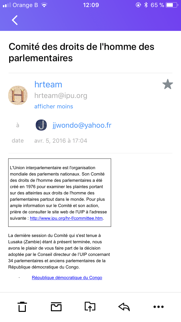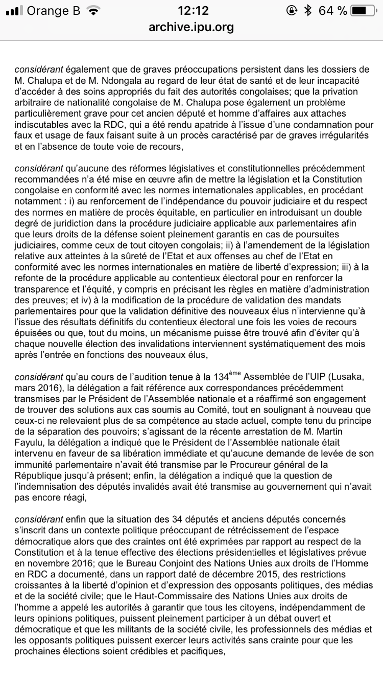 Pour rappel, en 2012, grâce notamment à la requête introduite suite à notre implication, la RDC a été sévèrement condamnée par l’UIP, malgré l’armada diplomatique, juridique et financière déployée en vain par Aubin Minaku, le président de l’Assemblée nationale congolaise. (Voir les documents détaillés en annexes).