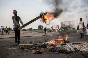 A supporter of Martin Fayulu, the runner up in the Democratic Republic of the Congo’s(DRC’S) elections, holds up a burning plank of wood as he protests in the street on January 21, 2019 in Kinshasa, against the decision of Felix Tshisekedi as president of the DRC.