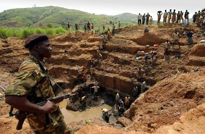 A soldier controls workers at the gold mine in Ituri region, Democratic Republic of Congo.
