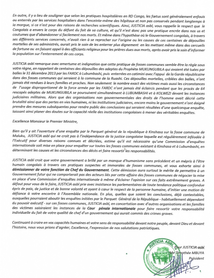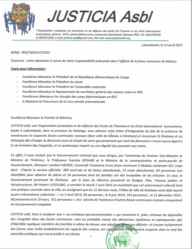 JUSTICIA ASbl vient d’adresser une lettre ouverte à Monsieur le Premier Ministre MATATA lui demandant de démissionner au sujet de sa responsabilité avérée et de son Gouvernement dans le charnier de Maluku. Nous vous prions d’en faire une large diffusion.