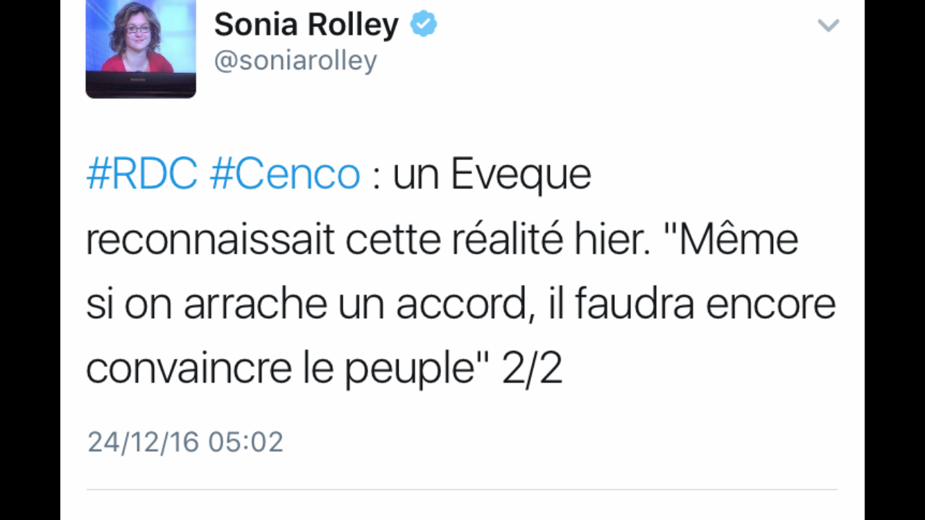 La perception d´une grande majorité des congolais est que la Cenco n´a pas été á l´hauteur dans cette mission…mais á long terme, ils vont comprendre que ces prélats congolais ont fait l´économie d´un bain de sang, des sacrifices humaines, des destructions des infrastructures ect..en obtenant á la fin l´exit de Kabila qui est contrain de designer un « dauphin »*